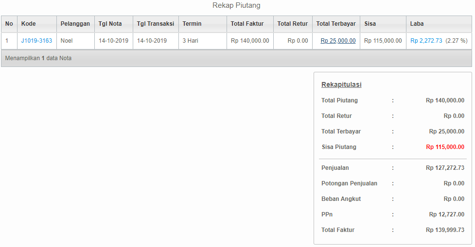 Sistem akan mencatat Rp. 25.000,00 sudah terbayar, dan sisa piutang Noel adalah Rp. 115.000,00