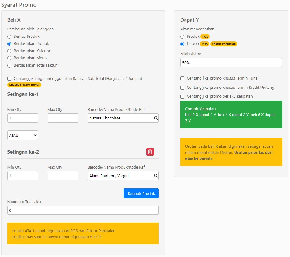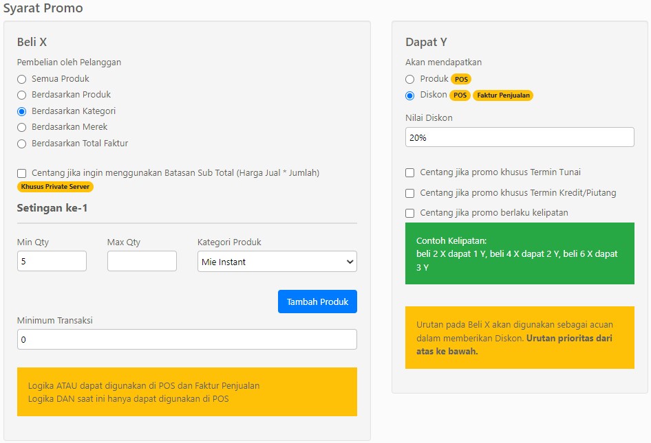 Logika ATAU dapat digunakan di POS dan Faktur Penjualan, sedangkan Logika DAN saat ini hanya dapat digunakan di POS