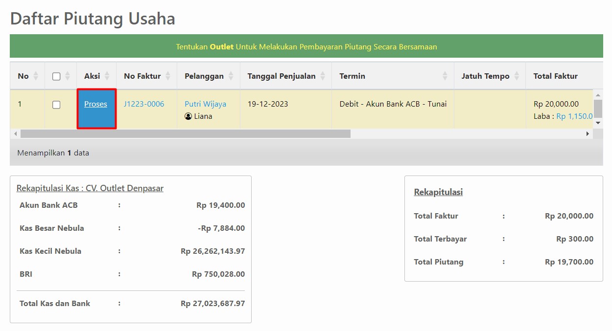Klik Proses pada data piutang yang ingin di proses pada Daftar Piutang Usaha. Gunakan filter Pencarian untuk membantu menemukan data Piutang Usaha yang ingin di Proses.