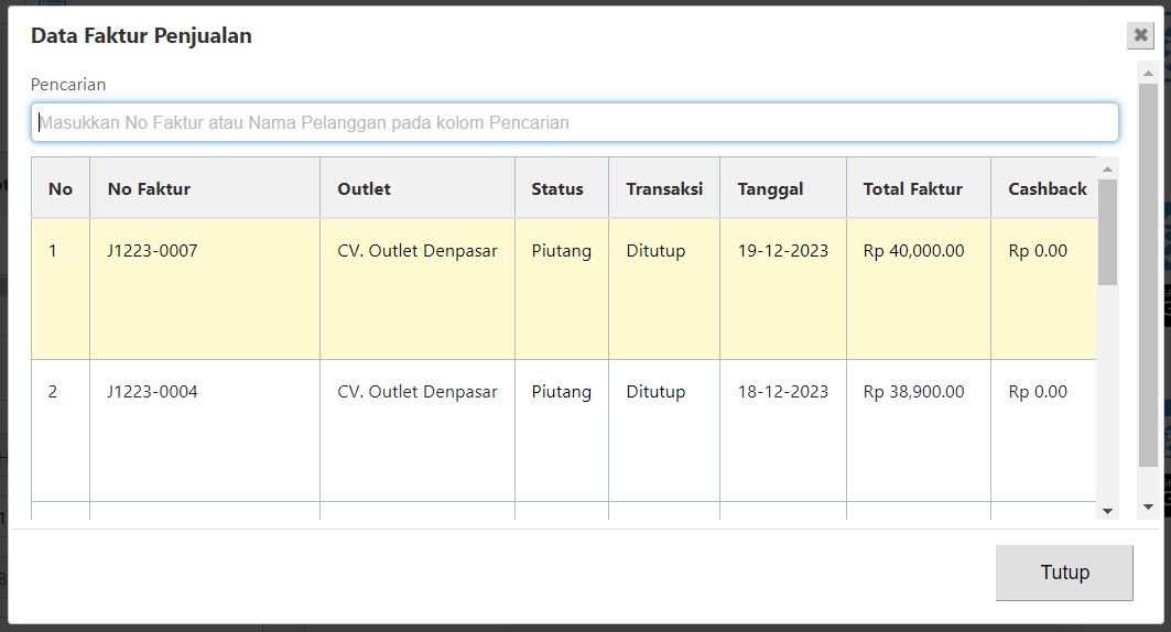 Berikut adalah Data Jurnal sesuai dengan Nomor Faktur Penjualan J1223-0007. Klik pada Nominal Total Faktur seperti gambar berikut untuk melihat Detail Transaksi.