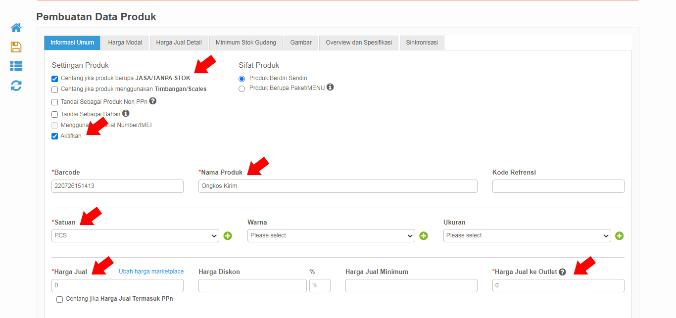- Setting Produk Jasa, Centang Jika Produk Berupa Jasa / Tanpa Stok