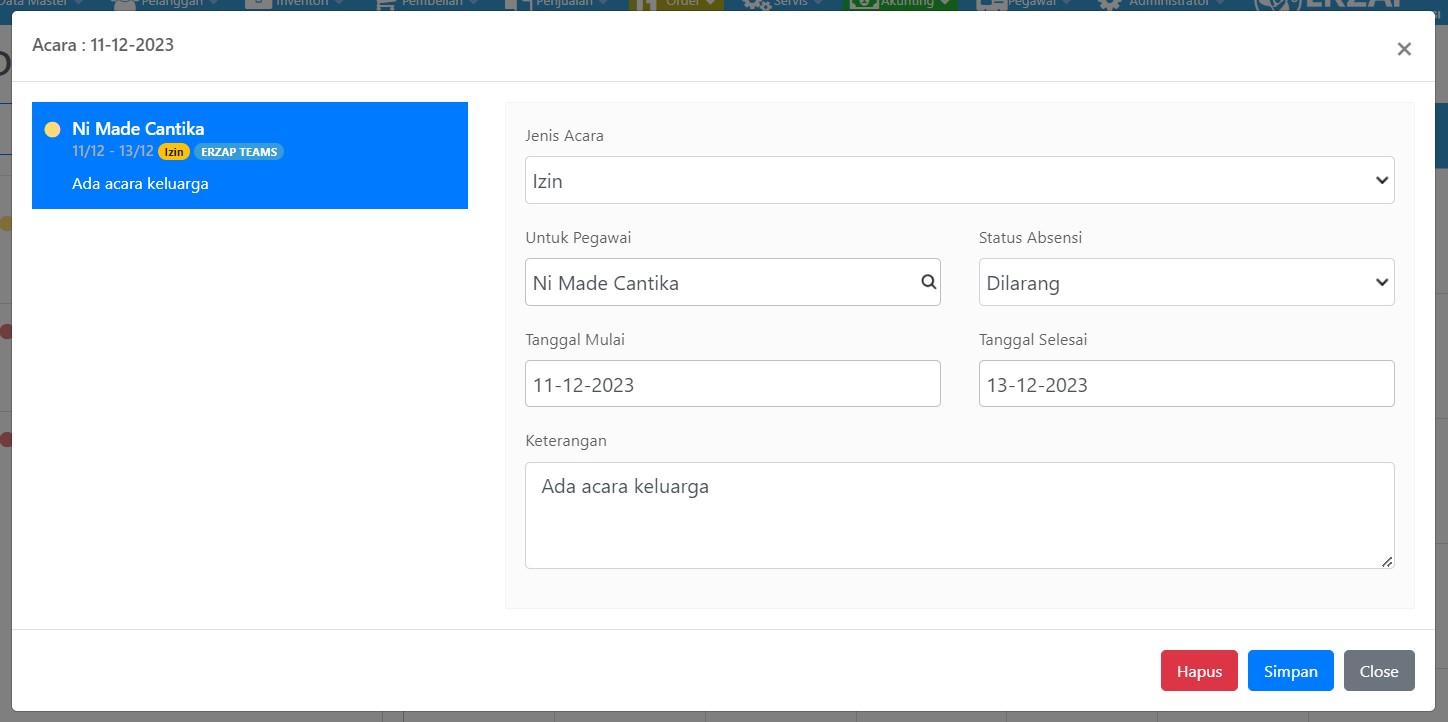 Dengan fitur izin cuti dan libur, HRD (Human Resource Development) dapat dengan mudah mengisi formulir permohonan dan memicu persetujuan izin. Selain itu, fitur ini memungkinkan perusahaan untuk mengelola hak cuti karyawan secara akurat, termasuk penghitungan hak cuti tahunan dan menyediakan informasi yang jelas mengenai data cuti pada perusahaan. Dengan demikian, Fitur Izin Cuti dan Libur Erzap ERP menjadi alat yang efektif dalam mendukung proses manajemen cuti, meningkatkan transparansi, dan mengoptimalkan efisiensi operasional perusahaan.