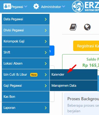 Fitur Izin Cuti dan Libur dapat diakses melalui menu Pegawai, kemudian menu Izin Cuti & Libur, lalu klik menu Kalender.