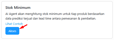 AI Agent secara otomatis menghitung stok minimum ideal untuk setiap produk. Perhitungan ini didasarkan pada data prediksi penjualan dan waktu tunggu (lead time) antara pemesanan dan pembelian. Klik tombol "Akses" untuk melihat bagaimana fitur ini dapat membantu Anda menghindari kehabisan atau kelebihan barang