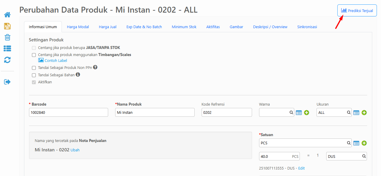 Prediksi Terjual: Kolom ini menunjukkan jumlah unit yang diprediksi akan terjual di masa mendatang, menjadi dasar utama rekomendasi. Contohnya, "Mi instan" diprediksi akan terjual sebanyak 1,005 PCS.