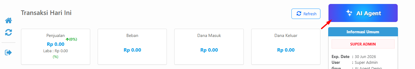 Aktivasi fitur AI Agent dapat dilakukan dengan mengakses Dashboard Erzap ERP lalu klik tombol AI Agent di kanan atas.