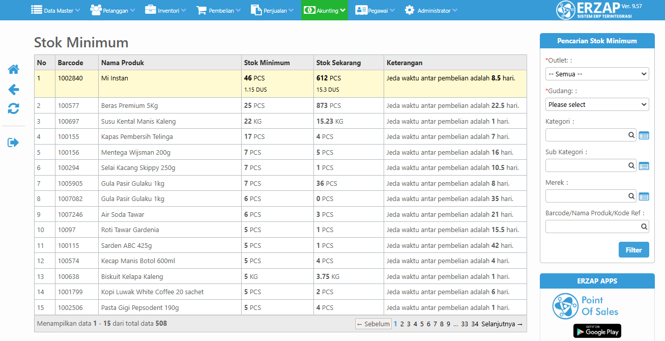 Mengingatkan kembali, nilai stok minimum di data master produk akan diubah dan dikelola secara otomatis oleh sistem.