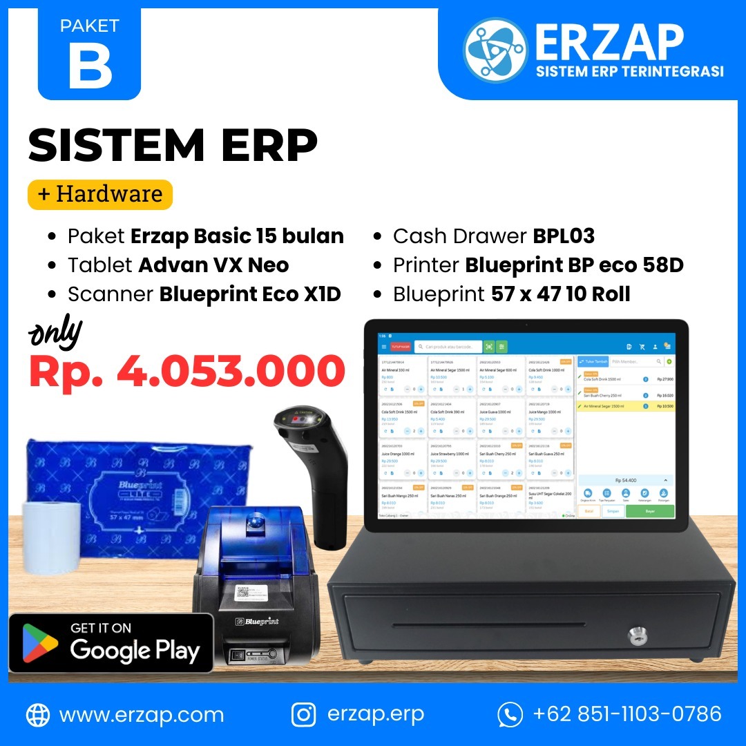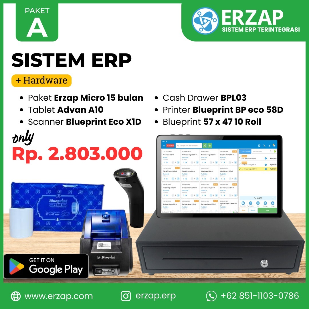 Kelola bisnis lebih cepat, rapi, dan profesional dengan Sistem ERP ERZAP yang sudah dilengkapi perangkat kasir siap pakai. Dirancang khusus untuk membantu pelaku usaha Service Center, Retail, Grosir, dan F&B, maupun berbagai jenis bisnis lainnya dalam mengelola transaksi, stok, hingga laporan bisnis secara otomatis dan terintegrasi.