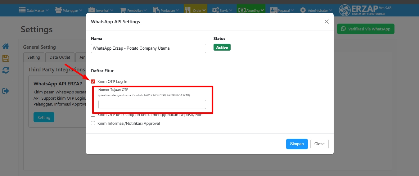 Fitur Kirim kode OTP Log in menggunakan WhatsApp API bertujuan sistem mengirimkan kode OTP otomatis ke Nomor WhatsApp perusahaan yang Terpusat atau ke nomer user pribadi saat proses login ke ERZAP.