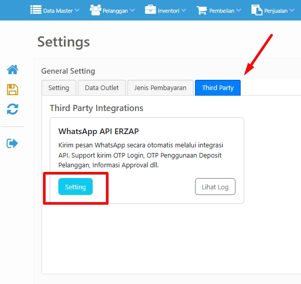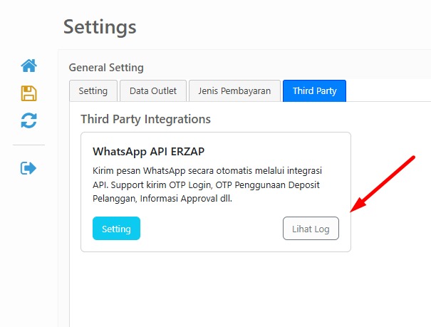 4. Cek Aktivitas Log dari menu Administrator → General Setting → Tab Third Party → pilih Lihat Log