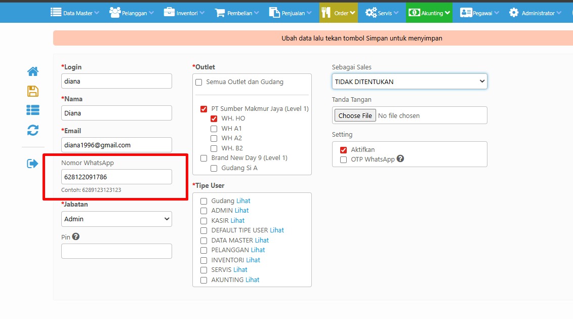 1. Pastikan kolom Nomer WhatsApp User sudah terisi di Management Data User
