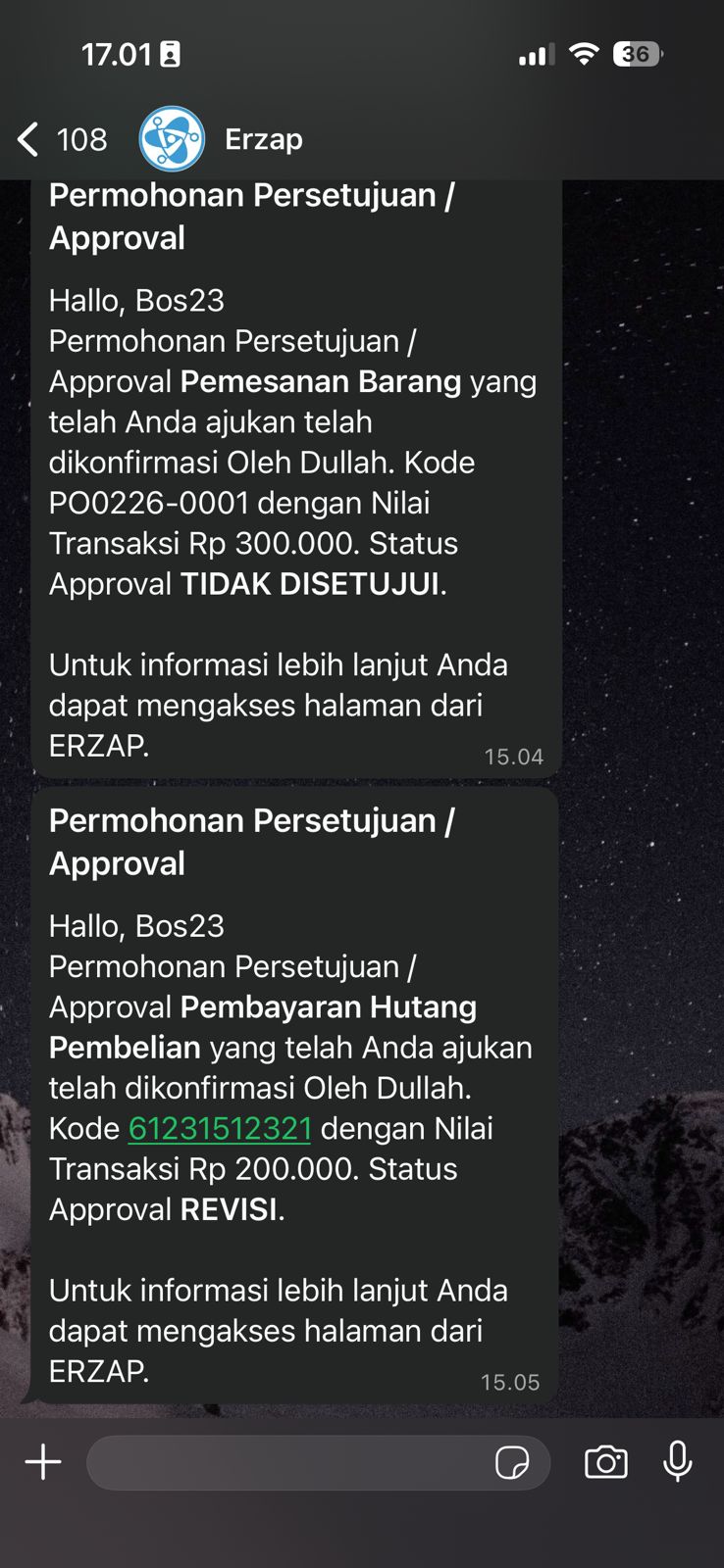 - Pesan Notifikasi yang dikirim ke User Approval
