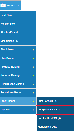 Setelah karyawan Anda selesai melakukan melakukan pemeriksaan dan pengisian formulir secara fisik maka langkah selanjutnya yaitu menginputkan data Stock Opnam tersebut ke sistem yang dilakukan oleh admin Anda, dengan menggunakan menu Pengisian Hasil SO.