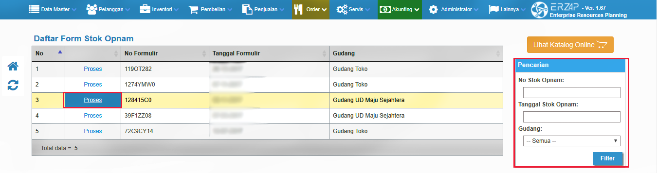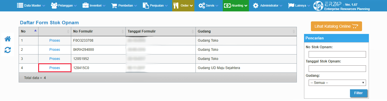 - Setelah itu Anda akan diarahkan kehalaman 'Daftar form Stock Opnam' lalu pilihlah data yang sesuai kemudian klik 'proses', dan bila ada banyak data pada menu ini sehingga Anda tidak dapat menemukan hasil yang diinginkan, Anda dapat mencarinya dengan menggunakan tabel pencarian pada bagian kanan, seperti gambar dibawah ini