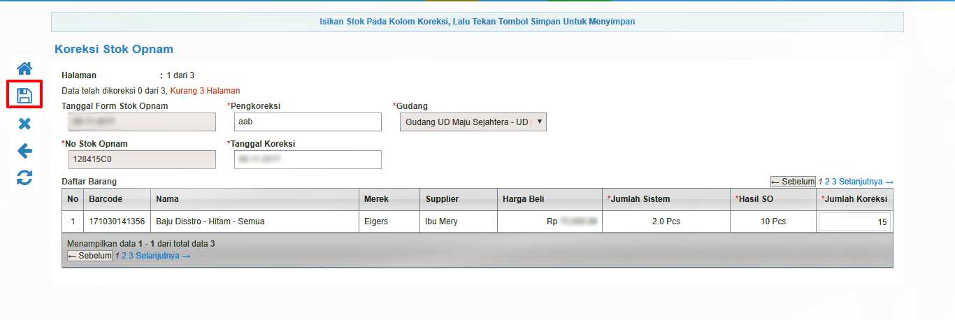 dan jika semua data telah terinput di setiap halaman maka klik simpan dengan ikon disket (disket tunggal) pada bagian sebelah kiri. - Jika sudah melakukan proses 'Simpan' pada modul 'Pengisian Hasil SO', maka akan muncul kembali formulir baru yaitu formulir baru yaitu formulir 'Koreksi Stok Opnam'. Pada Formulir Koreksi Stok Opnam, Sistem akan menampilkan perbedaan data stok antara stok fisik dan stok sistem. Koreksi Formulir SO ini berfungsi untuk mengkonfirmasi stok fisik yang tidak cocok dengan stok pada Sistem. Stok fisik yang cocok dengan stok Sistem tidak akan ditampilkan pada Form Koreksi SO.