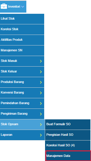 - Akseslah menu Inventory > Stock Opnam > Manajemen Data