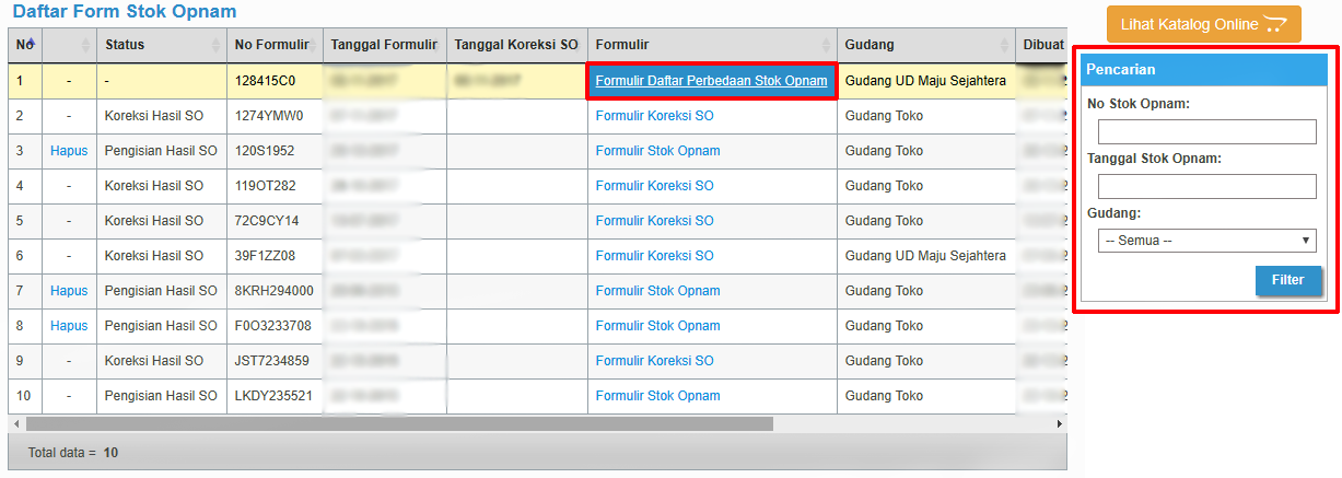 - Anda akan diarahkan ke 'Daftar Form Stock Opnam' dan pada menu ini Anda dapat melihat data - data yang telah dibuat. Dibagian kolom 'Formulir' Anda pun dapat mengkliknya untuk menampilkan formulir yang telah dibuat sehingga Anda dapat mencetak dan mengunduh kedalam format pdf. Jika terdapat banyak list sehingga Anda tidak menemukannya, Anda dapat memanfaatkan kolom pencarian yang berada di sebelah kanan tabel.