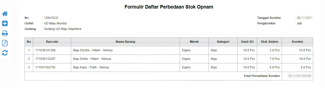 - Anda dapat mencetak Form Koreksi SO dengan mengklik icon Printer seperti pada gambar diatas. Anda dapat memberikan Form ini kepada petugas yang bertanggung jawab atas konfirmasi stok yang tidak cocok tersebut.