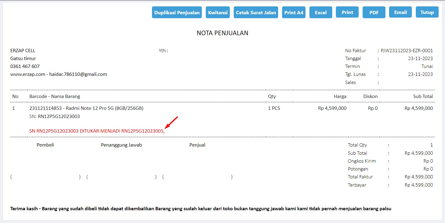Berikut adalah tampilan Nota Penjualan, terdapat informasi tambahan pada nota yang menunjukan bahwa pernah terjadi penukaran Serial Number.